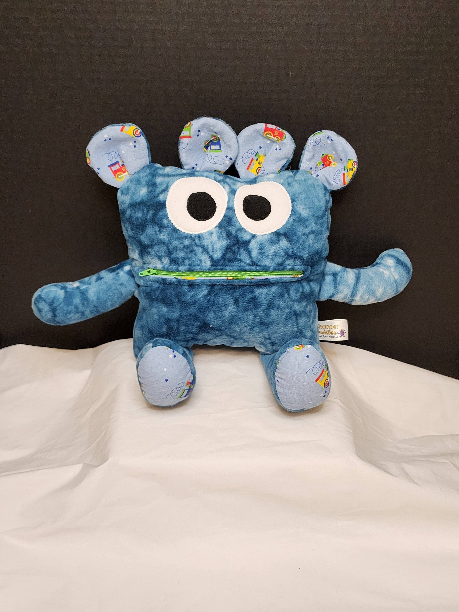 Write or draw your worries on a slip of paper and feed them into Charlie’s zipper mouth, letting him “chomp” them away and bring a little peace to your day. He’s also great for Tooth Fairy treasures, secret notes, or holiday wish lists! Crafted from blue swirl fleece and choo choo train cotton lining, Charlie combines snuggly softness with durable design — perfect for hugs, fidgeting, or quiet comfort.