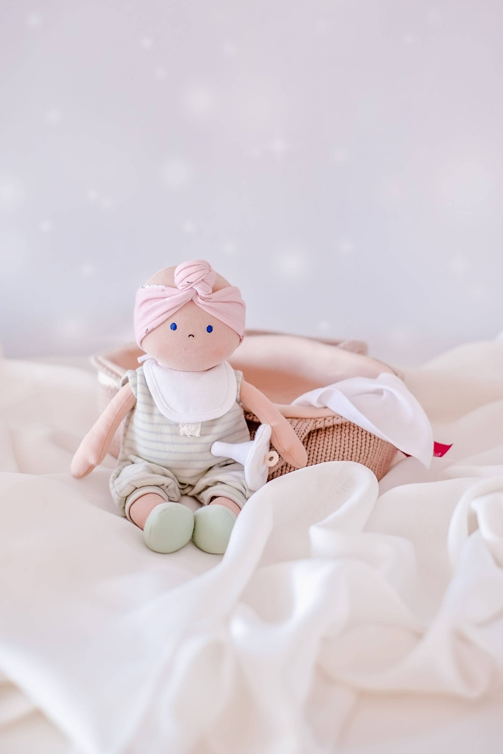 This hairless, baby-safe doll arrives with a knitted carry cot, cozy blanket, mini soother (binkie), and bib, all in soft, breathable 100% cotton jersey. Her embroidered facial features and cozy bandana make her a darling gift and a beautiful part of any childhood keepsake collection.