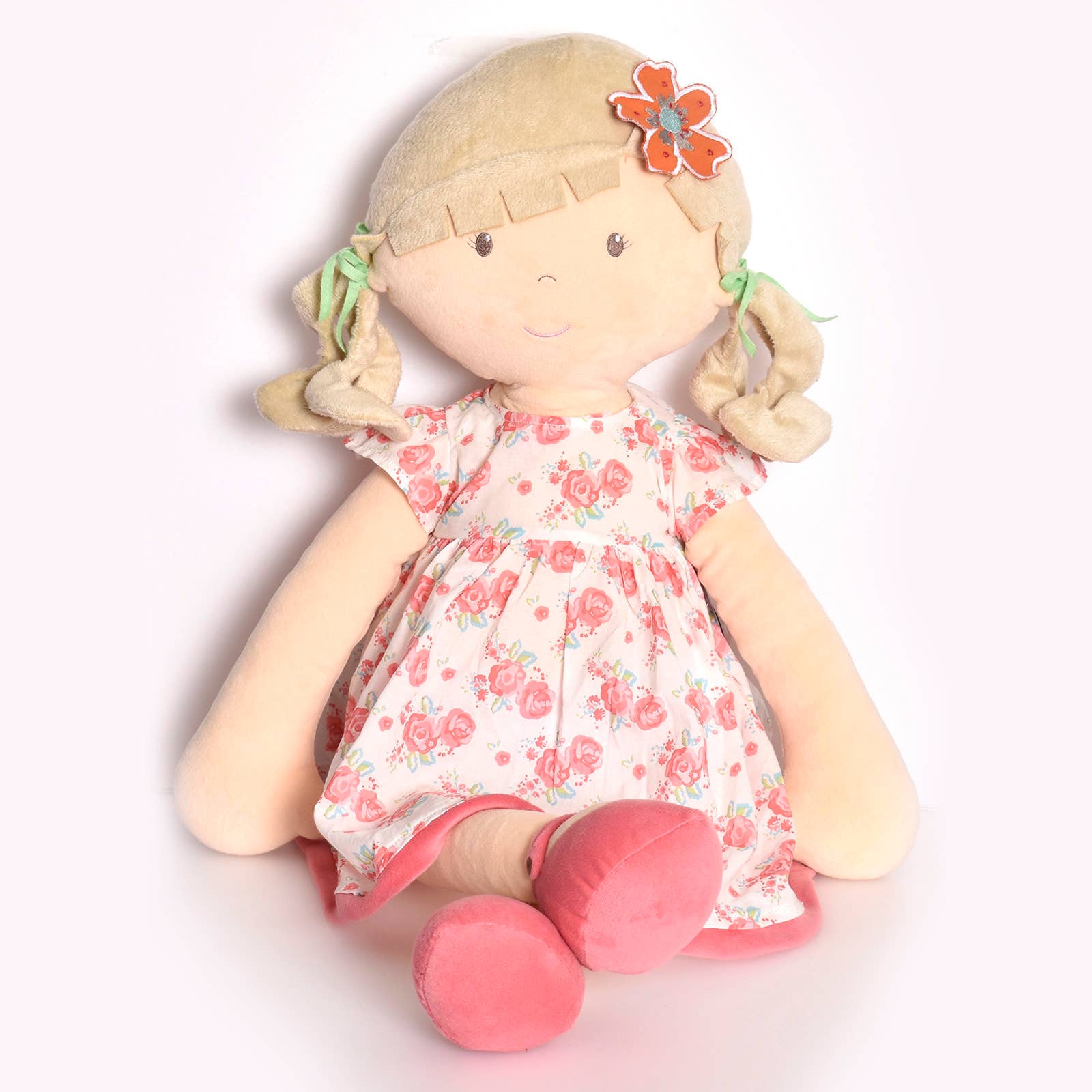 With her soft curly pigtails, matching floral hair adornments, and a removable 100% cotton printed dress, Scarlet is designed to charm from head to toe. Her embroidered facial features and eco-friendly recycled polyester filling make her a sweet, sustainable choice for both imaginative adventures and gentle snuggle time.