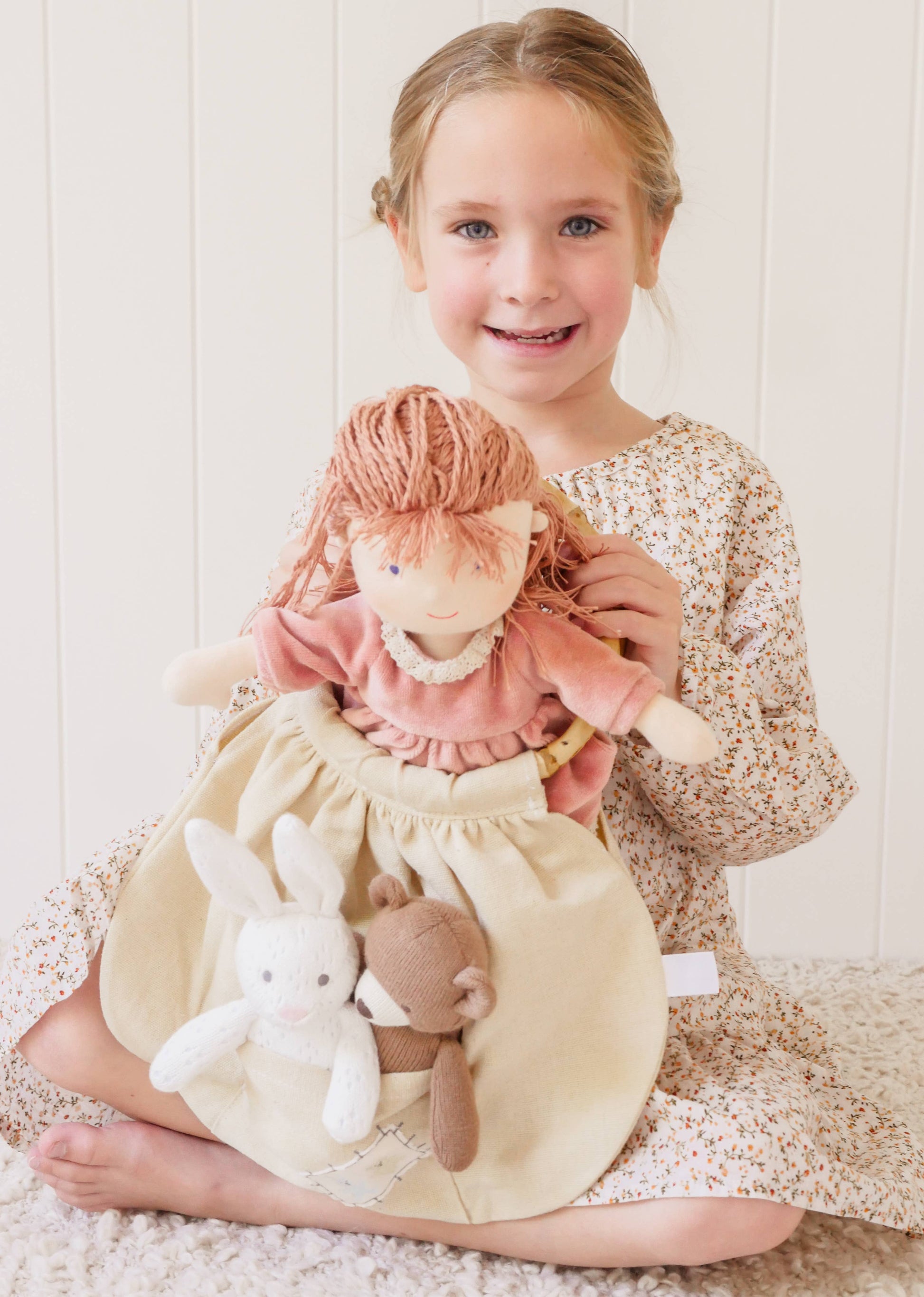 Perfect for carrying plush toys, dolls, or storytime treasures, this bag blends natural materials, timeless style, and playful imagination.